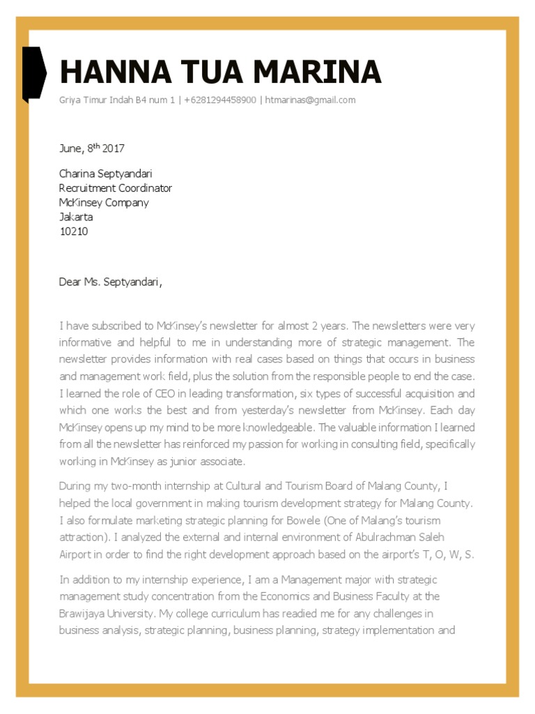 Mckinsey cover letter sample creative images. Cover letter if you are applying for a position at mckinsey, you will be competing with a large number. Consulting cover letter mckinsey sample. Hope these materials help you pass screening to mckinsey, bain, bcg and other consulting companies. A mckinsey cover letter sample better than 9 out of 10 other cover letters. In this video, i show you the. No, mckinsey does not really read the cover letteres. Bachman suggested that your cover letter to mckinsey could begin with something like this opener, which he wrote himself: Before writing your mckinsey cover letter, you need to make a list of your qualifications and accomplishments that match the skills mckinsey seek in candidates. Looking for mckinsey cover letters cover letter consultant management consulting? Consultant cover letter samples and writing tips. Essay writer funnyjunk our saviors lutheran church cover letter. Consulting cover letter writing tips and template 2019.